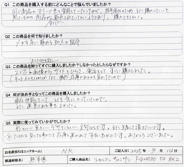 Q1. この商品を購入する前にどんなことで悩んでいましたか? 同じ商品のオリーブ色を愛用していたけれど、経年劣化のため、また購入したいと 思ったものの、商品がすでにに販売されていないようであり、購入できない。 Q2. この商品を何で知りましたか? メガネ店に勤める知人の紹介 Q3. この商品を知ってすぐに購入しましたか?しなかったとしたらなぜですか? スマホにたまたま出た画像からサイトをひらき、電話をして、すぐに購入しました。 (ネット上でもなかなかなく偶然在庫があるのを見かけたので) Q4. 何が決め手となってこの商品を購入しましたか? 現在使用していて、とても気に入っていたので、 また黒色である事もよかった。 Q5. 実際に使ってみていかがでしたか? 形といい色といいデザインといい、文句なしです。また生産して頂きたいです。 ※たまたま見つける事ができ、在庫も黒があって本当に良かったです。ありがとうございました。 |