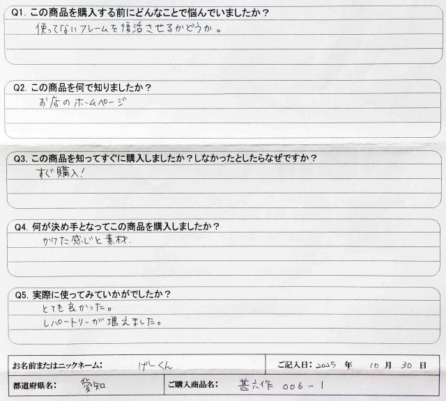 Q1. この商品を購入する前にどんなことで悩んでいましたか? 使ってないフレームを復活させるかどうか。 Q2. この商品を何で知りましたか? お店のホームページ Q3. この商品を知ってすぐに購入しましたか?しなかったとしたらなぜですか? すぐ購入! Q4. 何が決め手となってこの商品を購入しましたか? かけた感じと素材 Q5. 実際に使ってみていかがでしたか? とても良かった。 レパートリーが増えました。 |