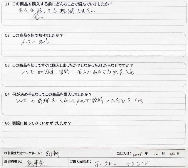 Q1. この商品を購入する前にどんなことで悩んでいましたか? 色々な光の眩しさを軽減させたい Q2. この商品を何で知りましたか? インターネット Q3. この商品を知ってすぐに購入しましたか?しなかったとしたらなぜですか? レンズが用途、目的に合うかわからなかったため Q4. 何が決め手となってこの商品を購入しましたか? レンズの詳細を詳しくメールで説明いただいたため Q5. 実際に使ってみていかがでしたか? |