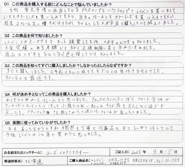 Q1. この商品を購入する前にどんなことで悩んでいましたか? 当初、楽天市場に出店しているグラスマニアというショップでレイバンを買いまして レンズもカラーレンズを買い入れてもらい、自分のフレームにもカラーレンズを買い入れてもらい、 結果2フレーム共にキズ付けられ、ちゃんとしたメガネ店で購入したいと悩んでました。 Q2. この商品を何で知りましたか? レイバンメガホークアイでネット検索した所、メガネのムラタを知りました。 大変、実績のある老舗だと知り、正規取扱い店と分かり決めました。 商品はメガネをなんとなく色々探していて知りました。 Q3. この商品を知ってすぐに購入しましたか?しなかったとしたらなぜですか? すぐに購入しました。2年前くらいに出てたモデルとは気付きませんでした。 知ったのは最近です。 Q4. 何が決め手となってこの商品を購入しましたか? ありそうで無かったフレームだと思いました。フォックスウェリントンぽくフロント全体が アーチ状になっていたり決して小顔では無い私にはサイズ感も大きくなり過ぎず 良いです。クラシックさと新しさが入り混じったフレームが気に入りました。 Q5. 実際に使ってみていかがでしたか? 本日、届いたばかりですが、梱包も丁寧で付属品も全てしっかり付いていて 今後レイバンはこの店で買おうと思いました。 |