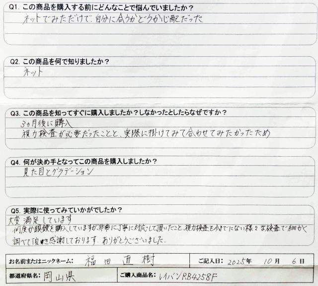 Q1. この商品を購入する前にどんなことで悩んでいましたか? ネットでみただけで、自分に合うかどうか心配だった Q2. この商品を何で知りましたか? ネット Q3. この商品を知ってすぐに購入しましたか?しなかったとしたらなぜですか? 3ヶ月後に購入 視力検査が必要だったことと、実際に掛けてみて合わせてみたかったため Q4. 何が決め手となってこの商品を購入しましたか? 見た目とグラデーション Q5. 実際に使ってみていかがでしたか? 大変満足しています 何度か眼鏡を購入していますが、非常に丁寧に対応して頂いたこと、視力検査も今までにない様々な検査で細かく 調べて頂き感謝しております。ありがとうございました。 |