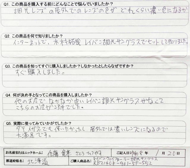 Q1. この商品を購入する前にどんなことで悩んでいましたか? 調光レンズの屋外でのレンズの色がどれくらい濃い色になるか Q2. この商品を何で知りましたか? インターネットで、木村拓哉 レイバン調光サングラスでヒットして知りました。 Q3. この商品を知ってすぐに購入しましたか?しなかったとしたらなぜですか? すぐ購入しました。 Q4. 何が決め手となってこの商品を購入しましたか? 他のお店で、なかなか良いレイバン調光サングラスがなくて こちらのお店が決め手でした。 Q5. 実際に使ってみていかがでしたか? ダテメガネでも使いたかったし、屋外では濃いレンズになるので 大満足です。 |