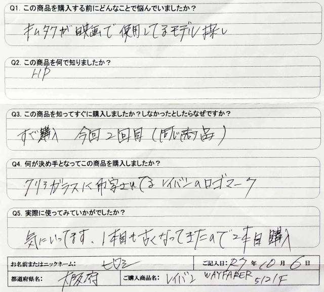 Q1. この商品を購入する前にどんなことで悩んでいましたか? キムタクが映画で使用しているモデル探し Q2. この商品を何で知りましたか? HP Q3. この商品を知ってすぐに購入しましたか?しなかったとしたらなぜですか? すぐ購入 今回2回目(同じ商品) Q4. 何が決め手となってこの商品を購入しましたか? クリアガラスに印字されてるレイバンロゴマーク Q5. 実際に使ってみていかがでしたか? 気にいってます。1本目も古くなってきたので2本目購入 |