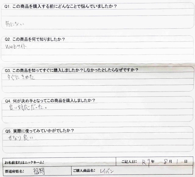Q1. この商品を購入する前にどんなことで悩んでいましたか? 特にない Q2. この商品を何で知りましたか? Webサイト Q3. この商品を知ってすぐに購入しましたか?しなかったとしたらなぜですか? すぐにきめた Q4. 何が決め手となってこの商品を購入しましたか? 良い対応だった。 Q5. 実際に使ってみていかがでしたか? かなり良い |