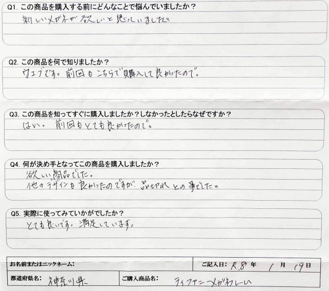 Q1. この商品を購入する前にどんなことで悩んでいましたか? 新しいメガネが欲しいと思っていました。 Q2. この商品を何で知りましたか? ウェブです。前回もこちらで購入して良かったので。 Q3. この商品を知ってすぐに購入しましたか?しなかったとしたらなぜですか? はい。前回もとても良かったので。 Q4. 何が決め手となってこの商品を購入しましたか? 欲しい商品でした。 他のデザインも良かったのですが、品切れとの事でした。 Q5. 実際に使ってみていかがでしたか? とても良いです。満足しています。 |
