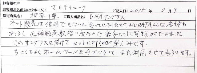 ネット販売は信用できないと思ってましたがMURATAさんは店舗もあるし正規販売取扱い店なので 安心に買物ができました。このサングラスを掛けてヨットに行くのが楽しみです。 ちょくちょくホームページをチェックして、また利用させてもらいます。 |