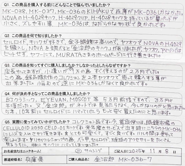Q1. この商品を購入する前にどんなことで悩んでいましたか? MK-38、MK-037、MK-036のKIHAKUで在庫がMK-036しかなかった。 NOVAのH-4029キハク、H-4029クリア、H-4028キハクを持っているが鼻パットが 小さく、ズレやすい事、MK-036は、なだらかな形状で良かったです。 Q2. この商品を何で知りましたか? セルロイド、キハクが好きで、金子眼鏡は高いので、ヤフオクでNOVAのH 4029 を購入し、NOVAを調べると「金治郎のキハク」がありましたが、ヤフオク、アマゾンでは ヒットせず、ヤフーにて、MURATAさまののホームページに行き着きました。 Q3. この商品を知ってすぐに購入しましたか?しなかったとしたらなぜですか? 店長やってますが、小遣いが月1万の為 すぐ使えるのが2万円でした。 この為、銘品春夫作のコレクションを2本ヤフオクで売って購入する事が 出来ました。悩むので逆にMK-036しかなくて良かったです。 Q4. 何が決め手となってこの商品を購入しましたか? BJクラシック、EYEVAN、MOSCOT等 5万円前後ですので、3万円と 手頃だった。又、「金治郎」がネットでは見当たらなく、今しかないのかと思いました。 5年、10年前にセルロイドにハマっていたらもっと安く買えたのにと思います。 Q5. 実際に使ってみていかがでしたか? コレクション品です。今普段遣いは眼鏡市場の CELLULOID 2030 CELD-01キハクです。来年磨きサービスで出す時にこちらのMK-36 にレンズを入れさせて頂きます。★とても可愛くて、すごく良いです。少しの間は飾って 楽しみます。★リサイクルショップの為、べっ甲、セルロイド、琥珀のアクセサリーをたくさん 見るうちに、特にキハクにハマってしまいました。 |