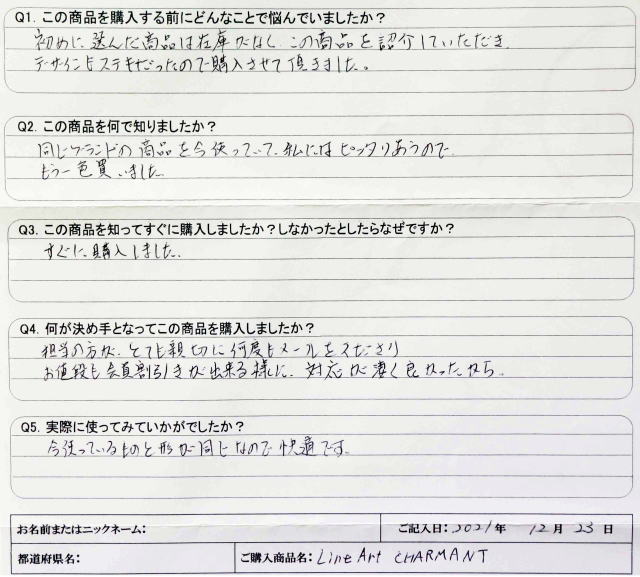 Q1. この商品を購入する前にどんなことで悩んでいましたか? 初めに選んだ商品は在庫がなく、この商品を詔介していただき、 デザインもステキだったんで購入させて頂きました。 Q2. この商品を何で知りましたか? 同じブランドの商品を今使っていて、私にはピッタリあうので、 もう一色買いました。 Q3. この商品を知ってすぐに購入しましたか?しなかったとし すぐに購入しました。 Q4. 何が決め手となってこの商品を購入しましたか? 担当の方が、とても親切に何度もメールをくださり お値段も会員割引きが出来る様に、対応が凄く良かったから。 Q5. 実際に使ってみていかがでしたか? 今使っているものと形が同じなんで快適です。 |
