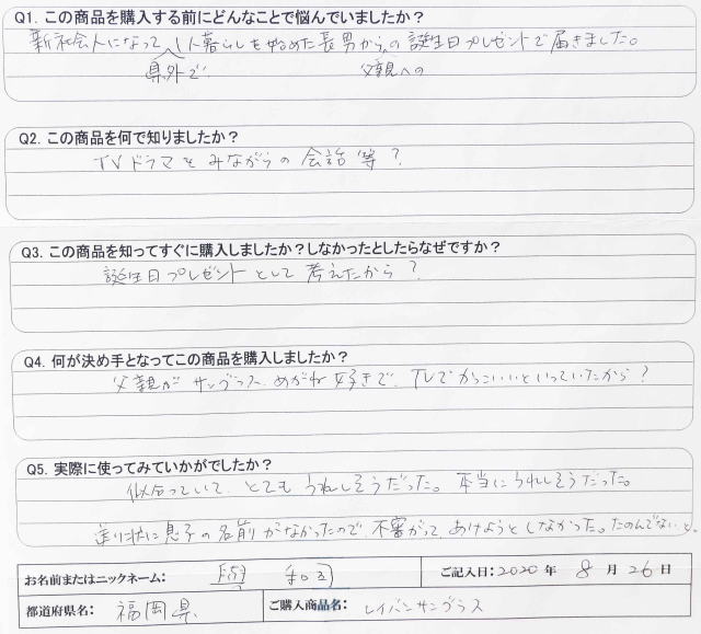 Q1. この商品を購入する前にどんなことで悩んでいましたか? 新社会人になって県外で1人暮らしを始めた長男から父親への誕生日プレゼントで届きました。 Q2. この商品を何で知りましたか? TVドラマをみながらの会話等? Q3. この商品を知ってすぐに購入しましたか?しなかったとしたらなぜですか? 誕生日プレゼントとして考えたから? Q4. 何が決め手となってこの商品を購入しましたか? 父親がサングラスめがね好きで、TVでかっこいいといっていたから? Q5. 実際に使ってみていかがでしたか? 似合っていて、とてもうれしそうだった。本当にうれしそうだった。 送り状に息子の名前がなかったので、不審がって、あけようとしなかった。たのんでないと。 |